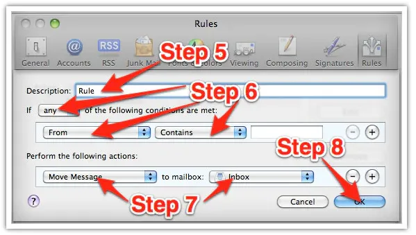 Select “Move Message” and “Inbox” from the drop-down menus.Click “Ok” to save the rule.
